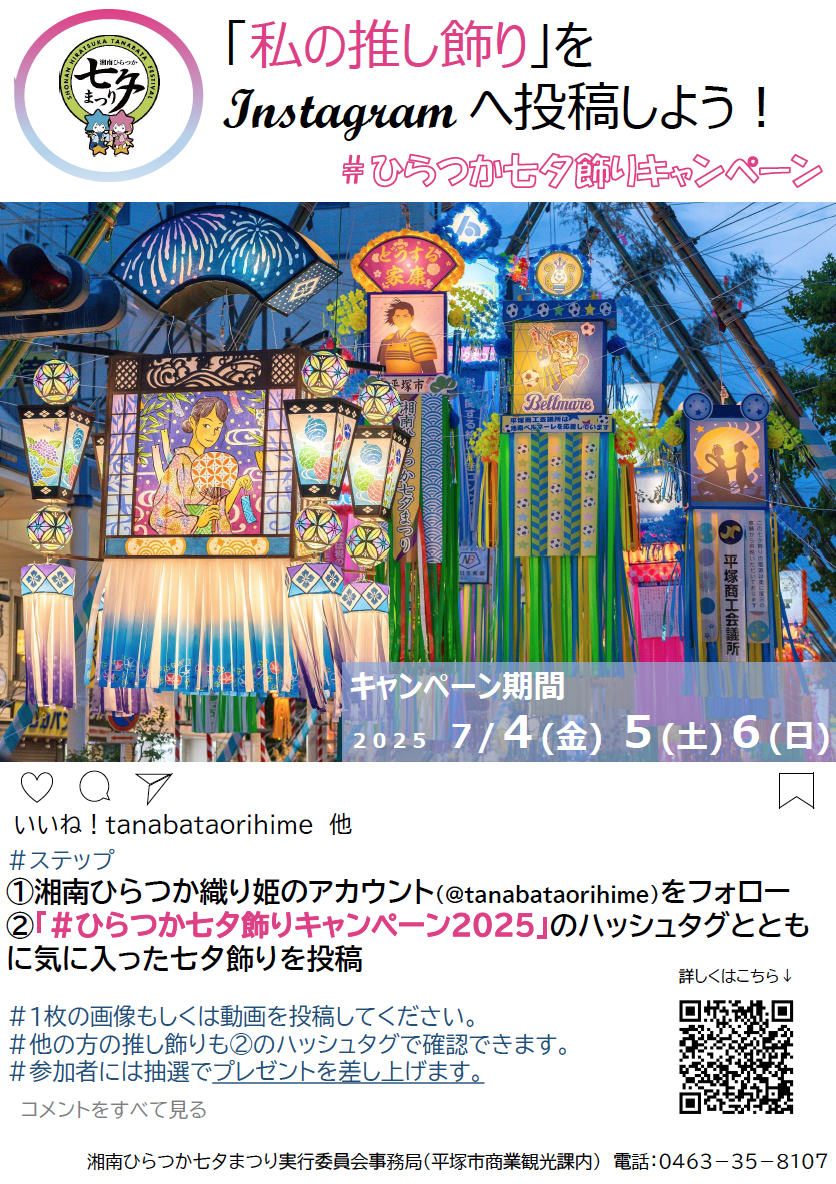 【期間】2025年7月4日(金)~6日(日) 【ステップ】 1. 湘南ひらつか織り姫のアカウント(@tanabataorihime)をフォロー 2.「#ひらつか七夕飾りキャンペーン2025」のハッシュタグとともに気に入った七夕飾りを投稿 【その他】 ・1枚の画像もしくは動画を投稿してください。 ・「#ひらつか七夕飾りキャンペーン2025」でタグ検索すると、キャンペーン参加者が選んだ”推しの七夕飾り”を見ることもできます。 ・参加者には抽選でプレゼントを差し上げます。